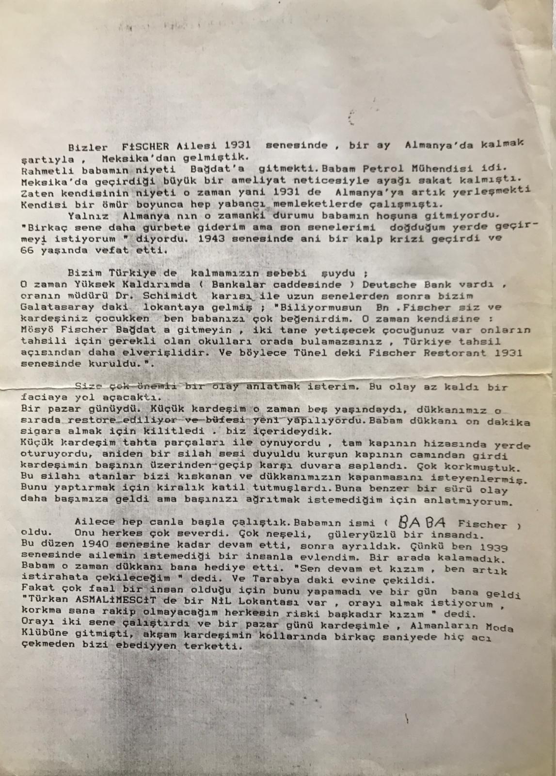 For instance, my husband took away the restaurant in Tünel from us and squandered my father's inheritance. In 1950, with the help of my brother, I left him. Because of that, others used our Fischer for years. He eventually died of throat cancer in 1967, and on his deathbed, he confessed to his relatives, saying, “I am paying for the wrongs I did to Türkan.”